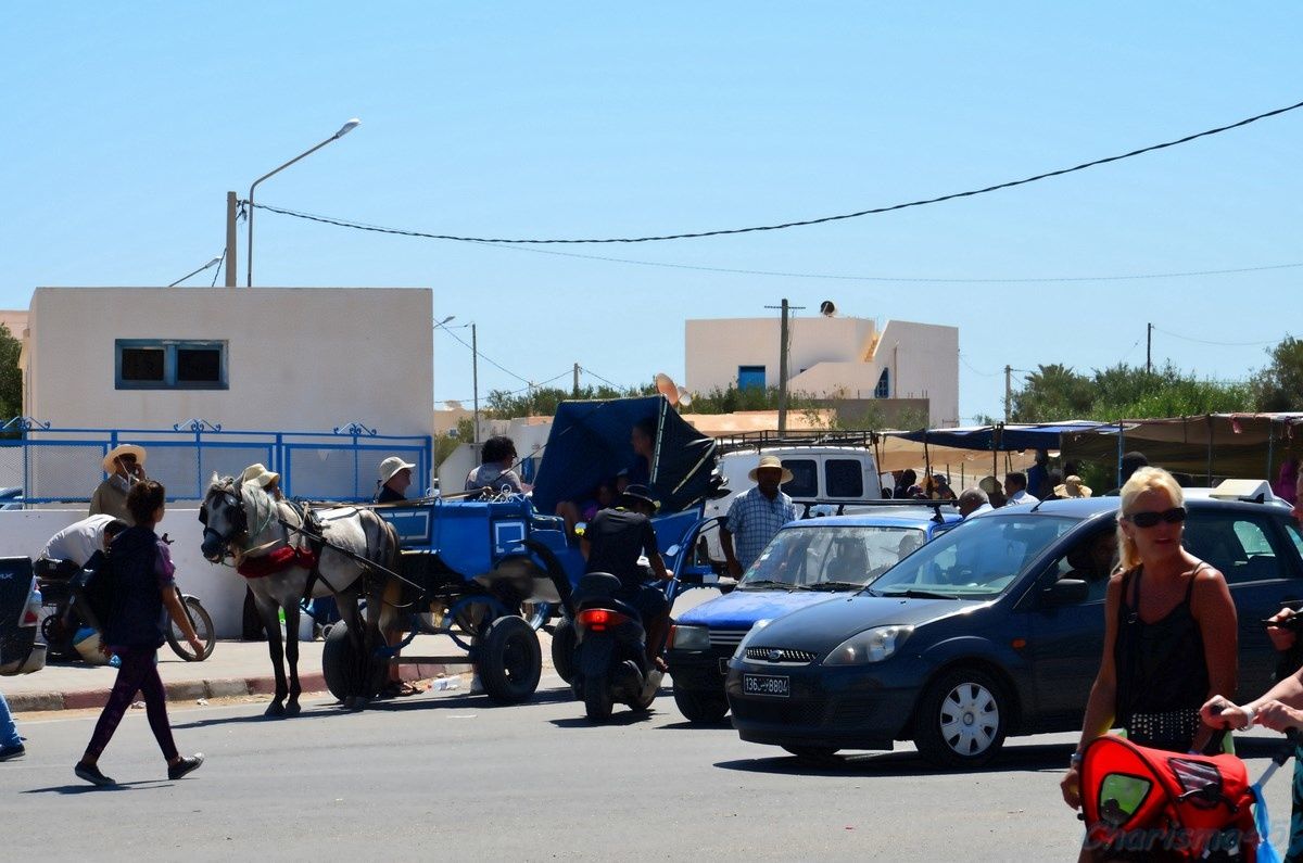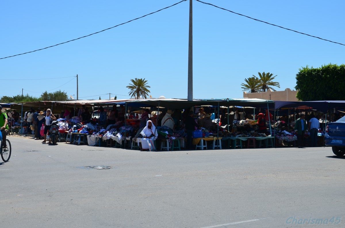 Nous allons faire un tour sur le marché de Midoun. Un taxi nous fait parcourir les 7 kms pour une bouchée de pain. Ici aussi ce sont les taxis qui attendent le client, rien à voir avec la France. Et en plus les chauffeurs, comme tous les tunisiens que nous avons rencontrés ici sont sympa.