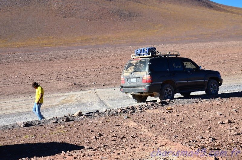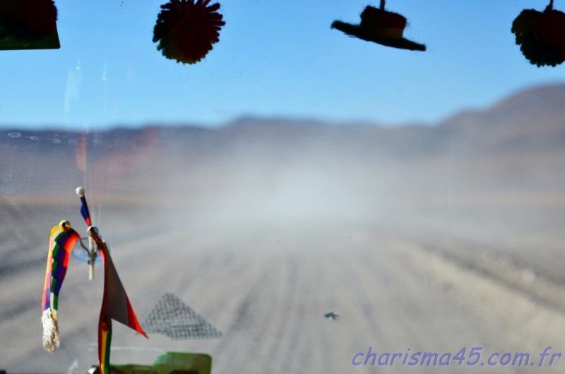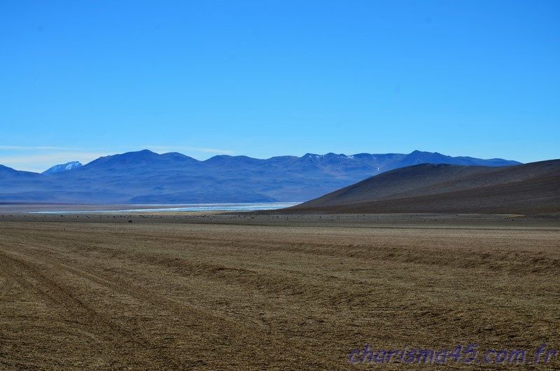 Raynaldo prend la piste par la laguna Caipina, grande réserve de borax dans le Nord-Lipez, pour rejoindre Villamar et Alota, et nous pouvons apercevoir au loin la laguna colorada, bien rouge.