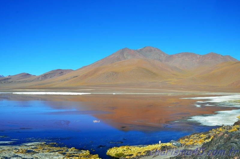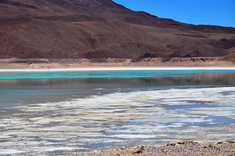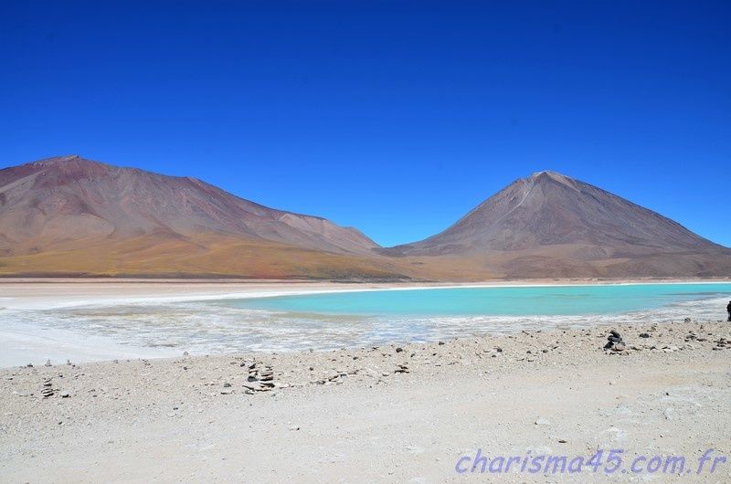 Puis au pied du Licancabur vient la laguna verde. Nous arrivons juste à temps pour assister à son changement de couleur. Nous ne repartons que lorsqu’elle affiche sa robe turquoise et filons vers la Laguna Chalviri et les thermes de Polquès.