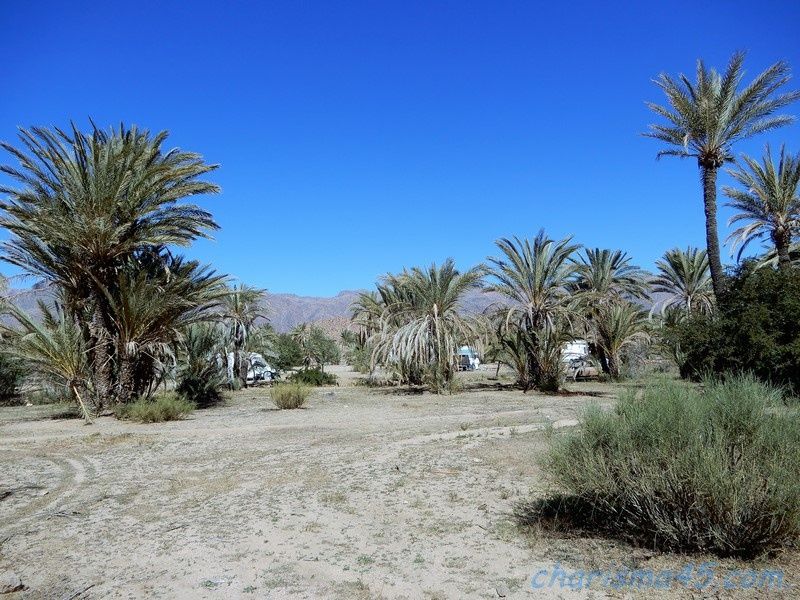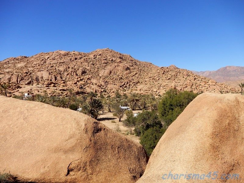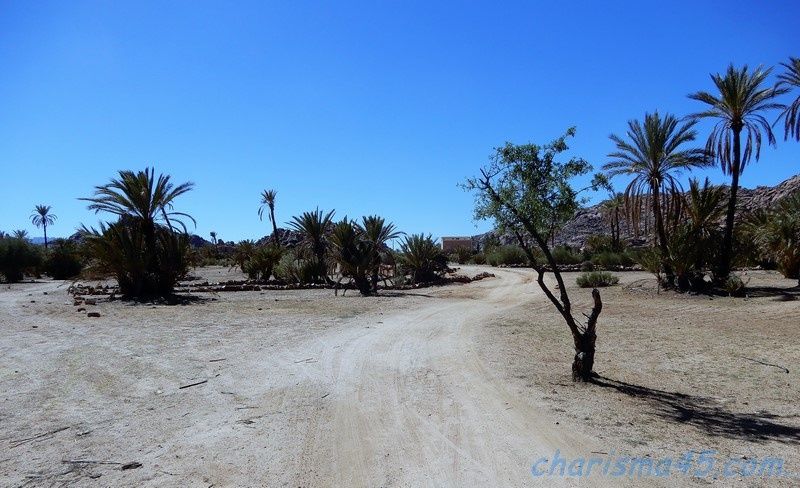 Je rejoins la palmeraie afin de trouver des gravures rupestres. Merci Maps’me pour trouver l’endroit et merci à un camping-cariste allemand pour trouver le bon rocher. Les camping-cars poussent dans tous les coins.